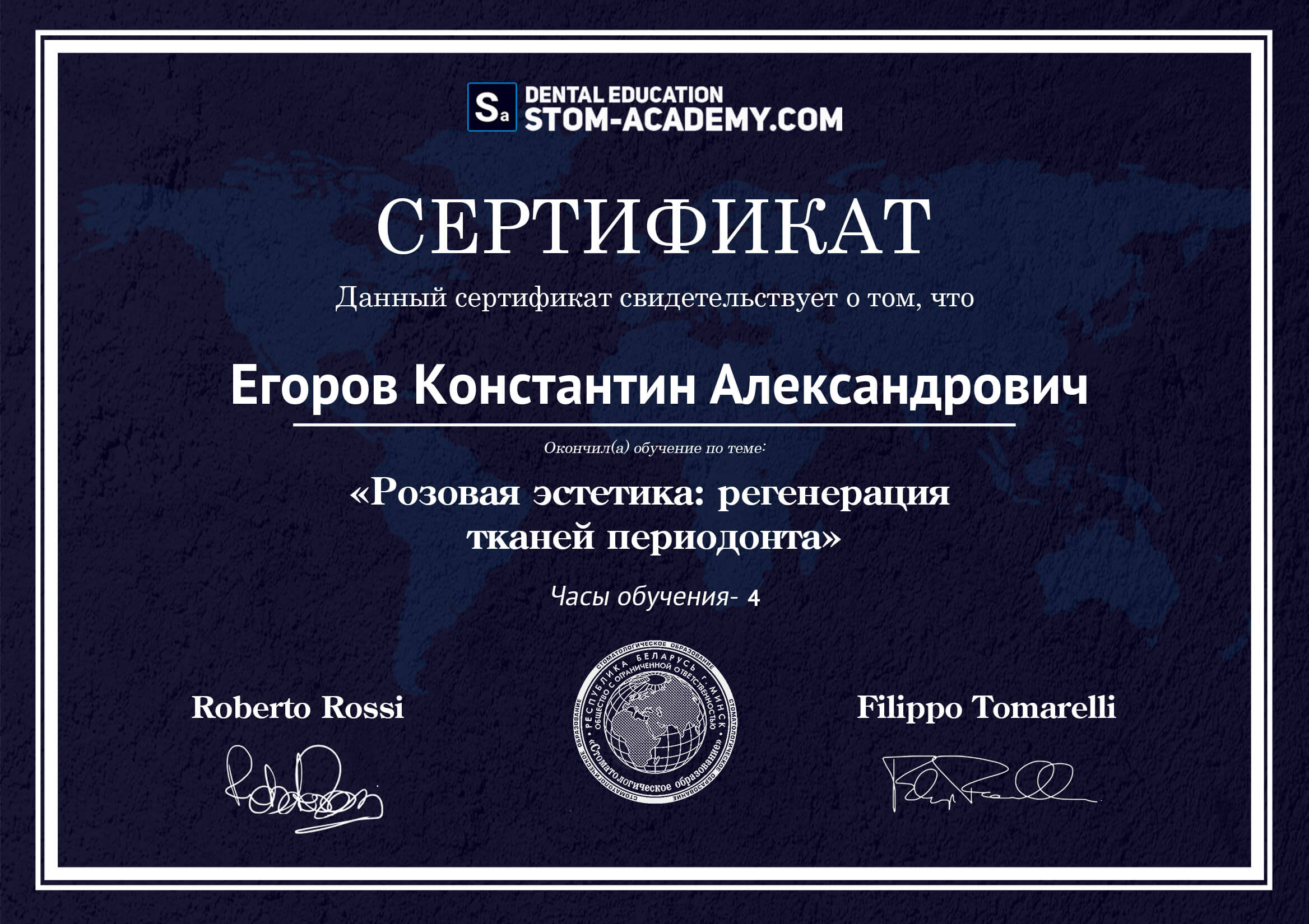 Successfully attended online course in quantity of 18 hours: Soft tissue plastic surgery around implants (HI OHI-S, Eugenio Longo, Roberto Rossi, Hua- Hong Chien, Giorgio Tabanella, Massimo Frosecchi, Stefano Parma Benfenati)